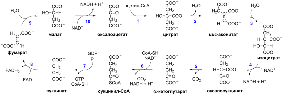 | Цитрат | 6-углеродное соединение | Начальный продукт цикла, образуется при соединении ацетил-КоА с оксалоацетатом |