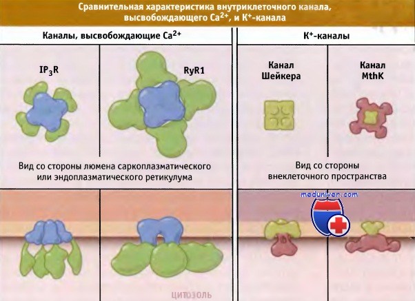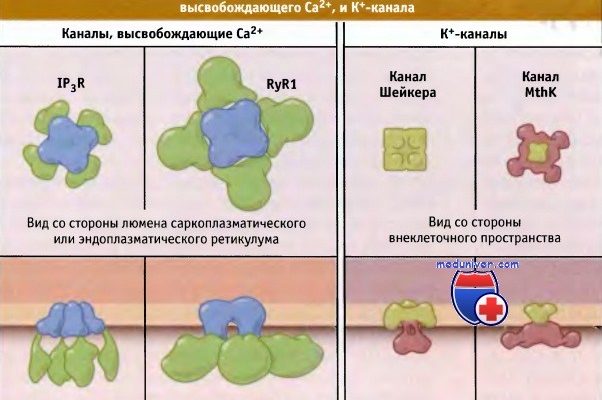 | Рановые кальциевые каналы | Мембрана саркоплазматического ретикулума | Высвобождение кальция в цитоплазму |